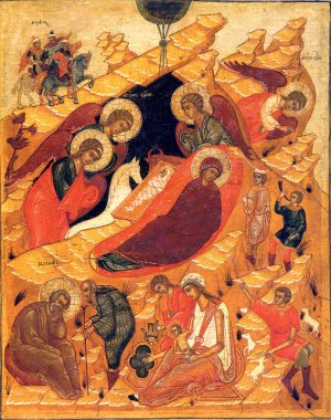 Maar die hoop vond haar oorsprong in de komst van de langverwachte Messias. Het kind waarvan de geboorte met een hemels licht werd verkondigd. Zonder zijn komst zou er geen verlossing zijn.Daarom is de geboorte van Jezus ook in de oosterse orthodoxie een feest dat een primaire plaats inneemt en op ontelbare ikonen die deemoedige vreugde toont.